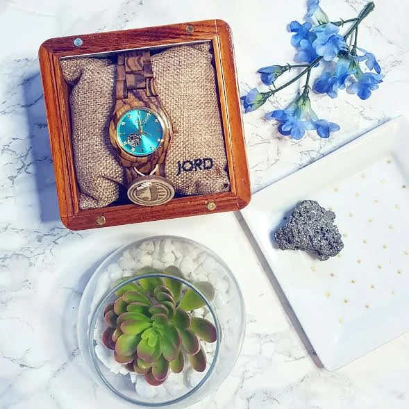 When I came across JORD watches I immediately thought of my Great Grandpa and his wood work. The watch bands come in many different styles and woods and you can just see the craftsmanship in them. The one I own feels nice and weighted so I can tell it is high quality. The links are beautifully curved to the wrist and smooth to the touch. You can see the wood grain shining through and it is such a great conversation piece. The face on my watch is turquoise with a tiny “skeleton” hole where I can see some of the gears in the watch peeking through.